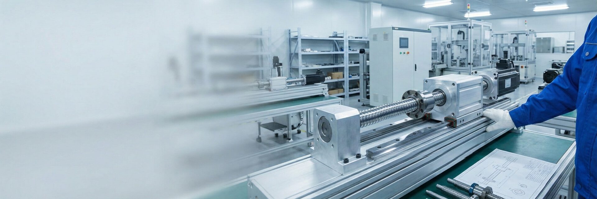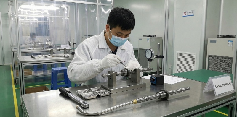 Clean room assembly prevents contamination as precision-graded balls are loaded into nuts, with preload adjustment and return tube installation verified by functional testing.