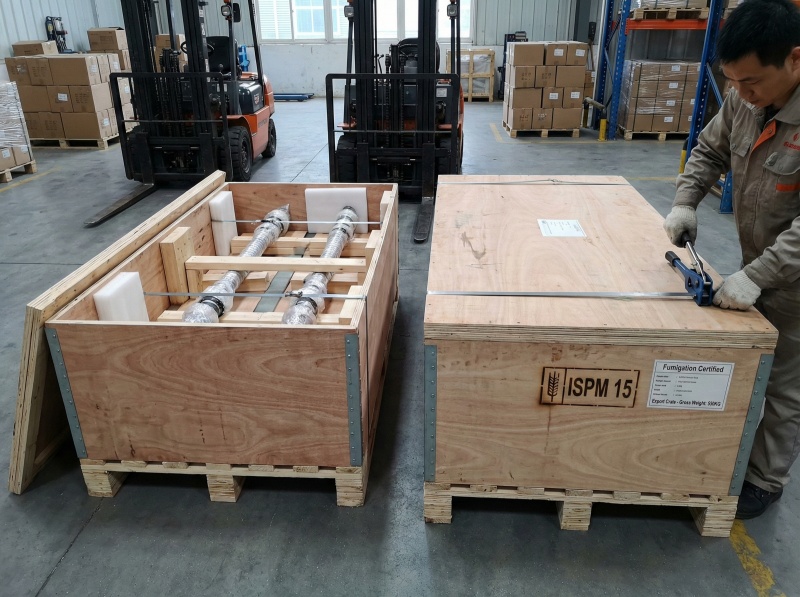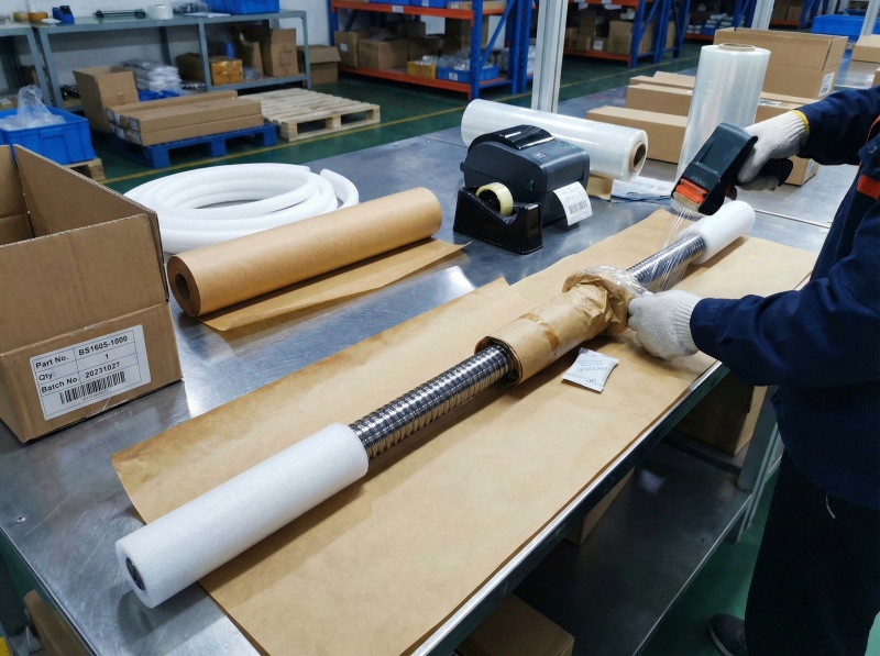 Each ball screw wrapped in oil paper to prevent corrosion, cushioned with PE foam tubes protecting threads and ends, then sealed in plastic film with desiccant packs controlling moisture exposure during storage and transport.