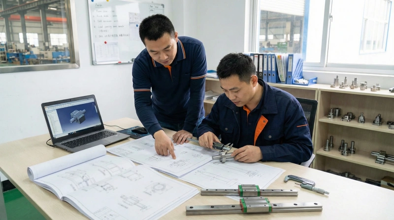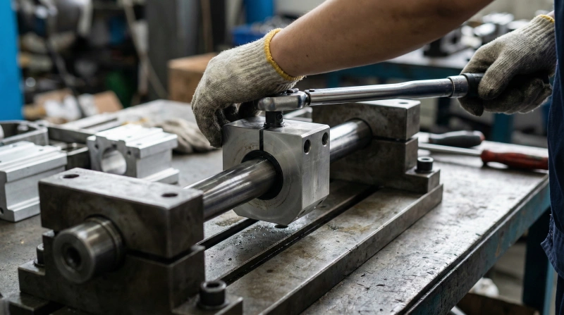 Sample units undergo practical installation and clamping force testing with actual linear shafts and torque verification.